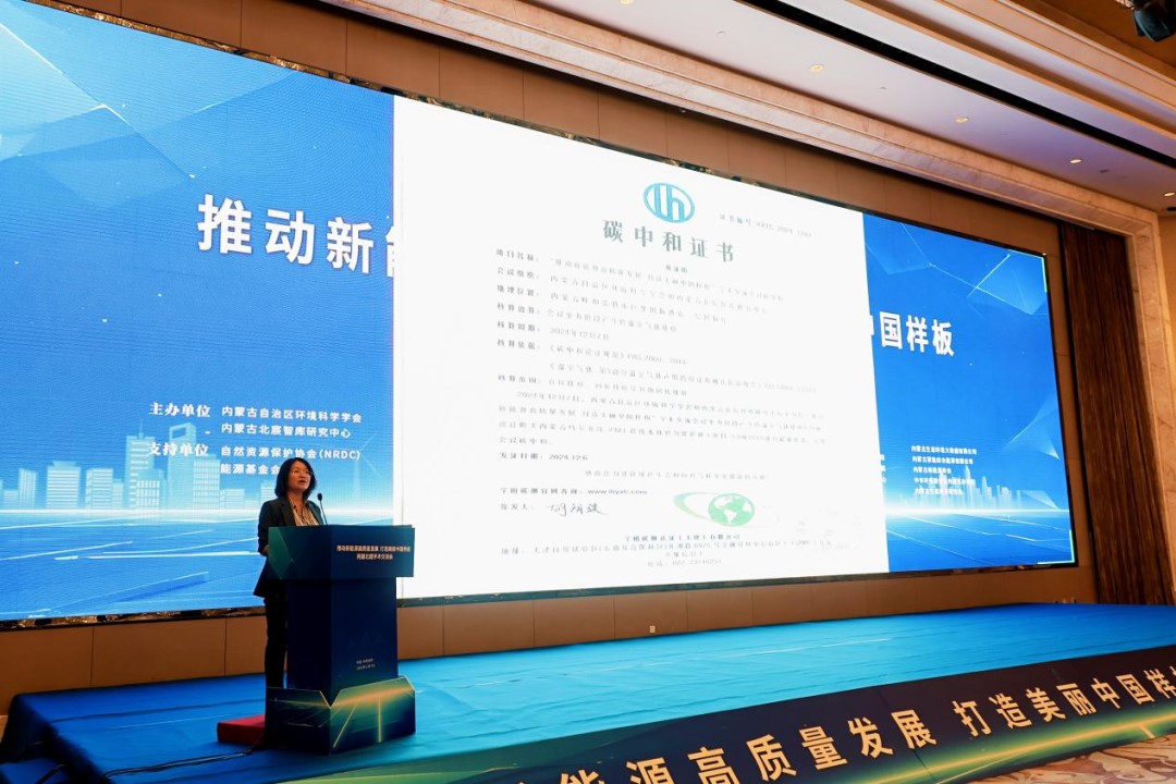 12月7日,内蒙古自治区环境科学学会、内蒙古北宸智库研究中心联合举办的“推动新能源高质量发展 打造美丽中国样板”亮丽北疆学术交流会议正在举行,主持人在大屏幕上展示了一张特殊的证书——碳中和证书,引发了与会人员的热议。