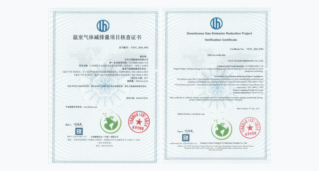 宇相碳测作为绿色低碳、可持续发展咨询认证的专业机构,充分发挥专业以及技术优势,为中交天津航道局有限公司提供温室气体减排量核算服务,为其颁发《温室气体减排量项目核查证书》。