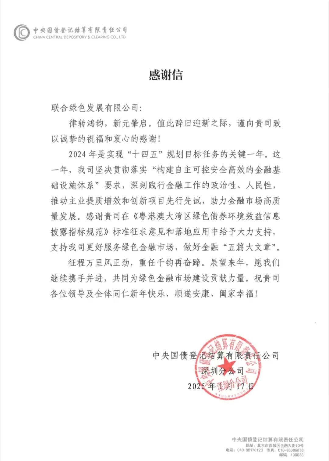 【概要描述】近日, 联合绿色发展有限公司(“联合绿色”)收到了中央国债登记结算有限责任公司(“中央结算公司”)深圳分公司的感谢信。信中对联合绿色在《粤港澳大湾区绿色债券环境效益信息披露指标规范》标准征求意见和落地应用中给予的大力支持表示感谢。联合绿色的支持帮助中央结算公司深圳分公司更好地服务绿色金融市场,并做好金融“五篇大文章”。