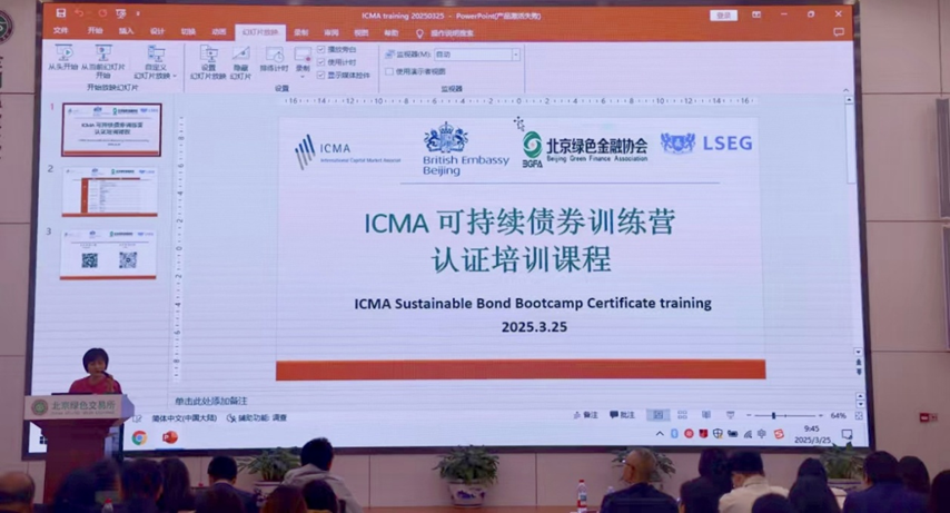 【概要描述】2025年3月25日,由英国驻华大使馆、北京绿色金融协会、国际资本市场协会(ICMA)和伦敦证券交易所集团联合主办的“ICMA可持续债券训练营”认证培训课程在全国温室气体自愿减排交易中心圆满落幕。联合绿色发展(以下简称“联合绿色”)的CEO戴麒佳女士作为主讲单位国际资本市场协会(ICMA)的特邀培训讲师,为与会者进行了全天的专业深入的培训课程。