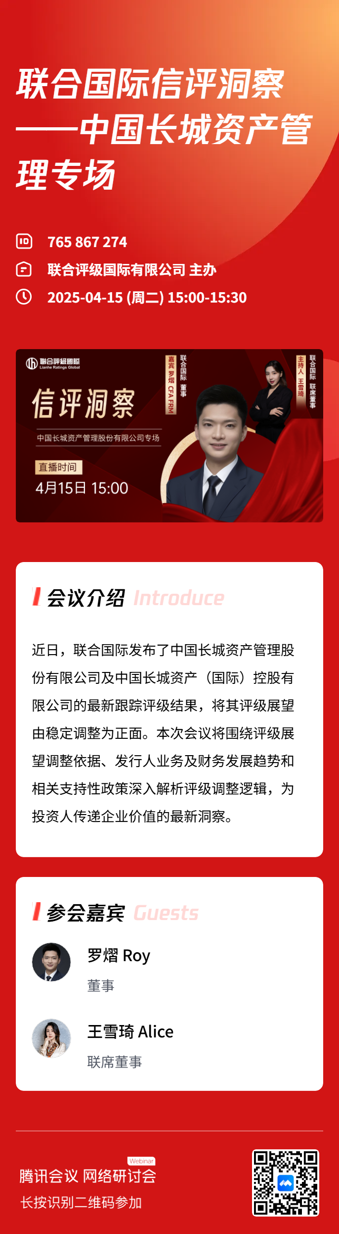 【概要描述】近日,联合国际发布了中国长城资产管理股份有限公司及中国长城资产(国际)控股有限公司的最新跟踪评级结果,将其评级展望由稳定调整为正面。本次会议将围绕评级展望调整依据、发行人业务及财务发展趋势和相关支持性政策深入解析评级调整逻辑,为投资人传递企业价值的最新洞察。