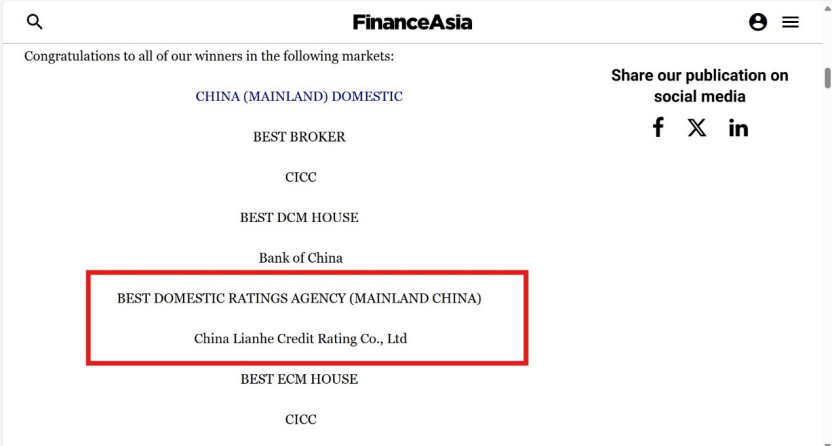 联合资信荣获《亚洲金融》2025年度“中国大陆最佳评级机构”称号