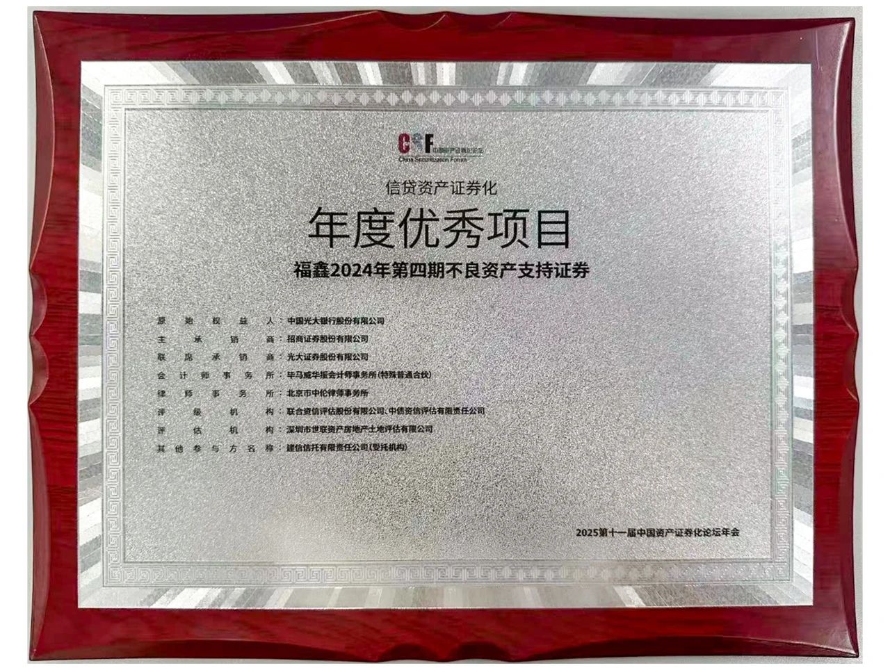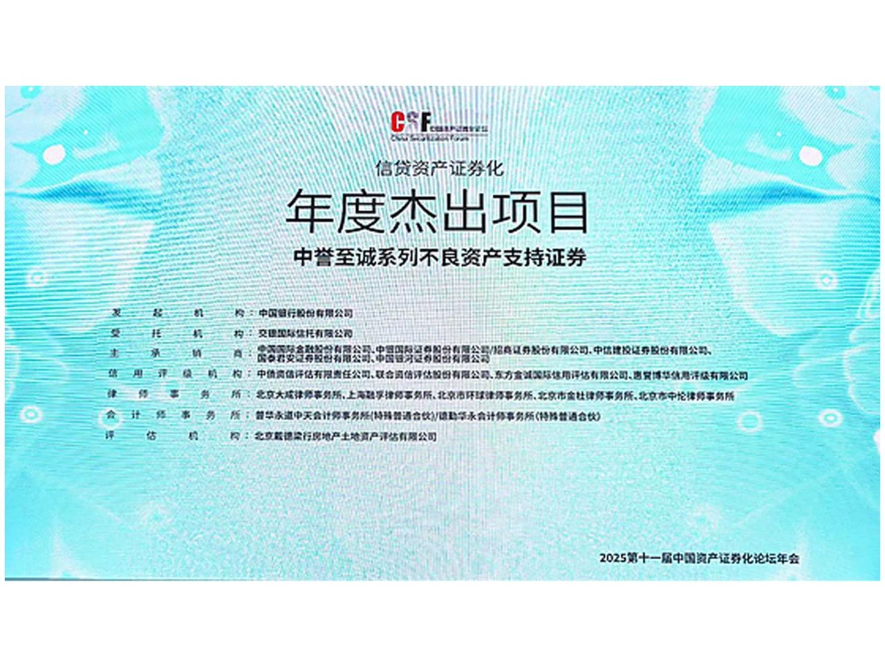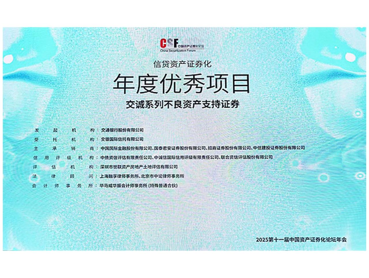 【概要描述】2025年5月27-28日,第十一届中国资产证券化论坛(CSF)年会在北京成功举行(以下简称“CSF论坛”)。联合资信凭借资产证券化评级的专业能力,广泛的市场覆盖率及突出的创新能力,荣获第十一届CSF论坛“年度杰出机构”嘉勉。同时,联合资信参与的多个资产证券化项目分获论坛各类别奖项,以下为具体获奖情况: