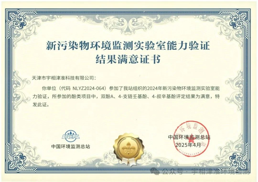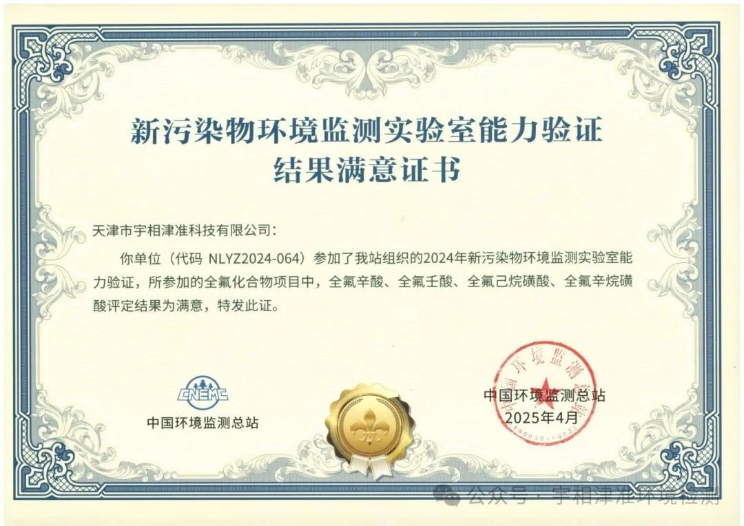 2025年4月宇相津准成功通过由国家环境监测总站组织的严苛能力验证考核,荣获《新污染物环境监测实验室能力验证结果满意证书》。这标志着我们在新污染物环境监测领域的技术实力、数据精准度与质量管理体系,获得了国家权威机构的高度认可。