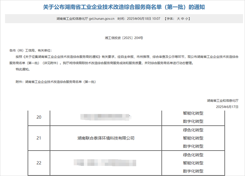 喜讯!近日,湖南省工业和信息化厅正式发布《湖南省工业企业技术改造综合服务商名单》,湖南联合泰泽环境科技有限公司凭借在节能环保领域深厚的技术积淀、卓越的绿色化改造服务能力以及显著的实践成效成功入选。
