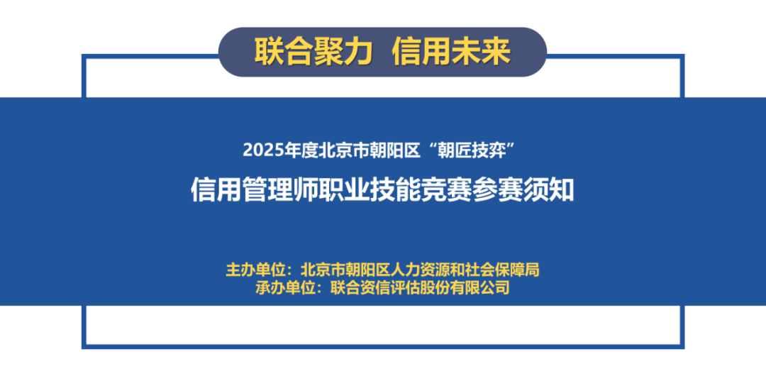 为响应国家及北京市号召,支持朝阳区加大技能人才选拔,促进金融产业高技能人才的培养和发展,由北京市朝阳区人力资源和社会保障局主办、联合资信评估股份有限公司承办的2025年度朝阳区“朝匠技弈”信用管理师职业技能竞赛现已开启报名。本次竞赛面向16周岁以上(2008年1月1日以前出生),法定退休年龄以内的个人进行征集,要求参赛者参加北京社保(朝阳区参保者优先)。团体报名应为注册地或经营地在朝阳区的相关单位机构。具体参赛报名方式如下: