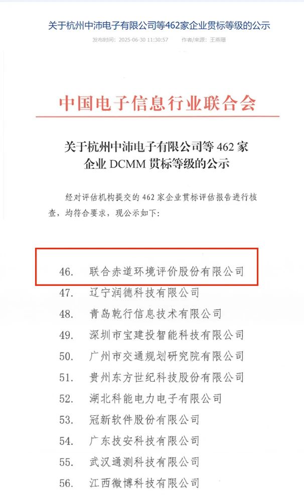 【概要描述】在数字化浪潮席卷全球的今天,数据已成为企业发展的核心资产和战略资源。经过长期的精心筹备与不懈努力,联合赤道环境评价股份有限公司凭借扎实的数据管理基础、科学的管理体系和卓越的实践成果,于2025年6月30日成功通过数据管理能力成熟度评估模型(DCMM)认证!这一里程碑式的突破,不仅是对联合赤道数据管理能力的高度认可,更标志着联合赤道在数字化转型的道路上迈出了坚实且意义非凡的一步!