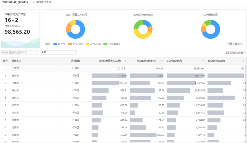 区域经济作为联合区域与城投数据产品主要版块之一,整合了全国所有省级、地市级、区县及园区级行政区域的主要经济、财政和债务数据,具有数据资源丰富多维、区域覆盖全面等特点。