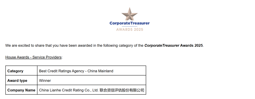 近日,Haymarket媒体集团旗下的《企业财资人》(CorporateTreasurer)公布了2025年年度奖项评选结果。联合资信评估股份有限公司(以下简称“联合资信”)以领先的市场地位,突出的业务亮点,以及出色的投资人服务能力,再次获得“中国大陆地区最佳信用评级机构”奖。这是继2025年4月赢得《亚洲金融》(FinanceAsia)颁发的“2025年度最佳信用评级机构”奖后,公司获得的又一重要国际奖项。