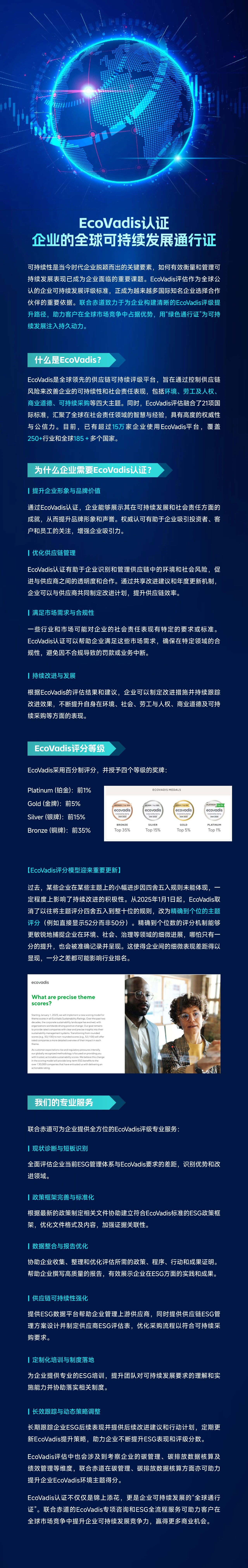 【概要描述】可持续性是当今时代企业脱颖而出的关键要素,如何有效衡量和管理可持续发展表现已成为企业面临的重要课题。EcoVadis评估作为全球公认的企业可持续发展评级标准,正成为越来越多国际知名企业选择合作伙伴的重要依据。联合赤道致力于为企业构建清晰的EcoVadis评级提升路径,助力客户在全球市场竞争中占据优势,用“绿色通行证”为可持续发展注入持久动力。