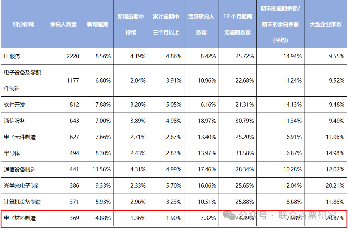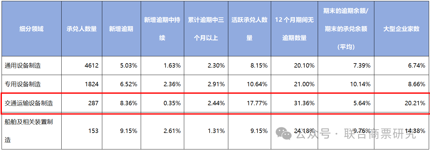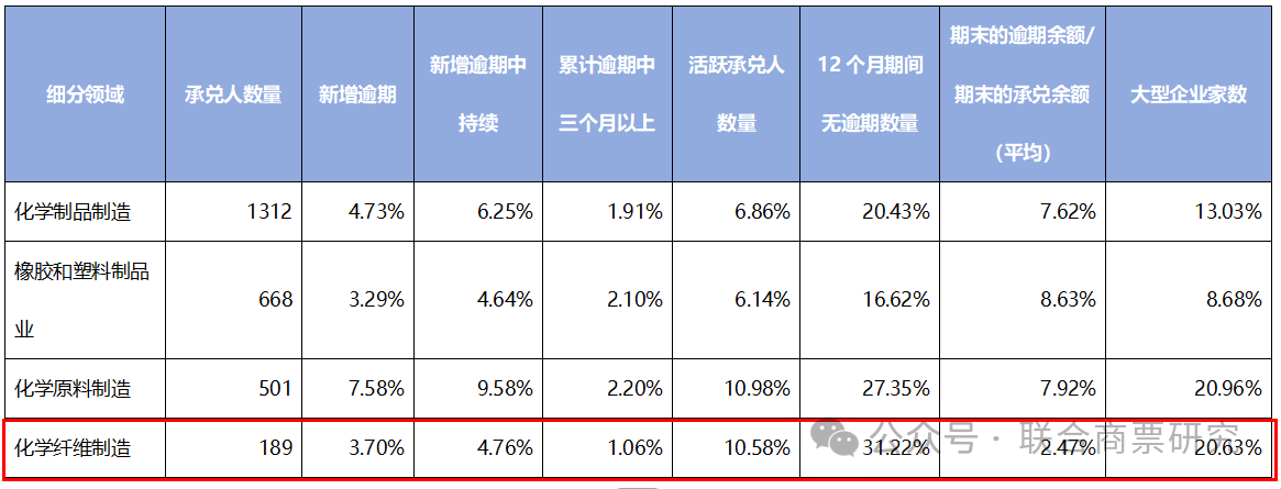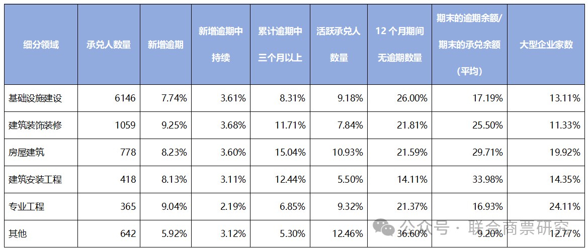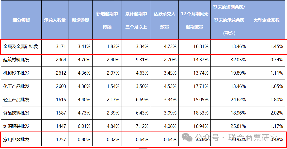 联合评价通过承兑人数量、近期新增承兑人数量、近期新增且持续逾期承兑人数量、逾期持续三个月以上承兑人数量、活跃承兑人数量、最近无逾期承兑人数量、期末逾期余额/期末承兑余额、大型企业家数等统计数据构建指标,对主要细分领域的商票投资价值进行排序分析,有较好的效果。