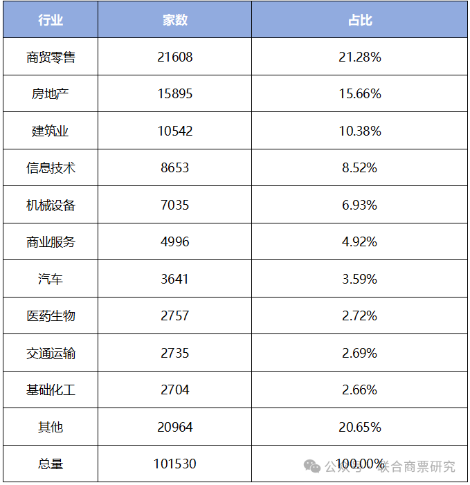 从行业分布看,目前10余万家承兑人中,前十大行业:商贸零售、房地产、建筑业、信息技术、机械设备、商业服务、汽车、医药生物、交通运输、基础化工领域的承兑人占总数量的80%左右。